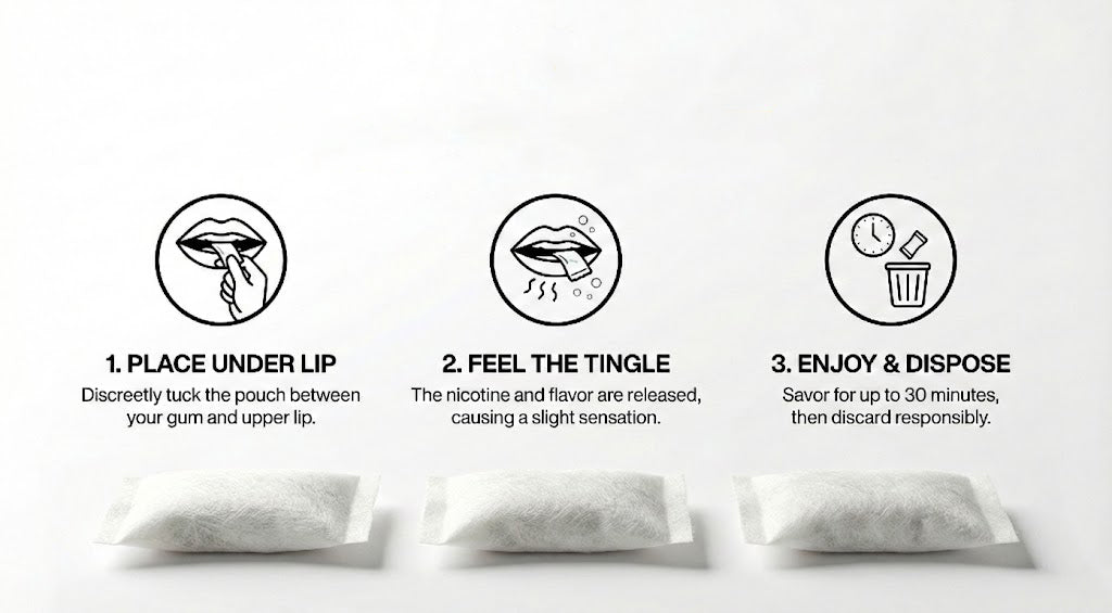 Open the can, remove one pouch and place it under your upper lip. The pouch sits against the gum, where nicotine is absorbed through the lining of the mouth.